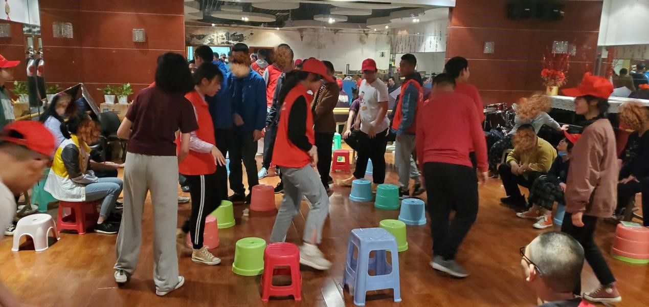 第一个环节是抢凳子游戏。在活动中,学员们在志愿者的帮助下,积极参与。在欢快且有强烈节奏感的背景音乐下,志愿者与学员们绕着几张凳子转圈,根据主持人的提示做出反应,场面十分热闹。经过几轮精彩绝伦的比拼,胜出者获得了志愿者精心准备的小礼物。