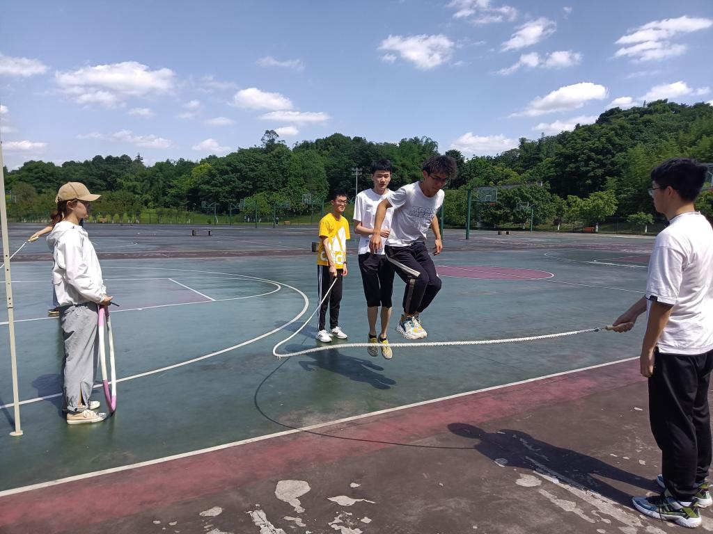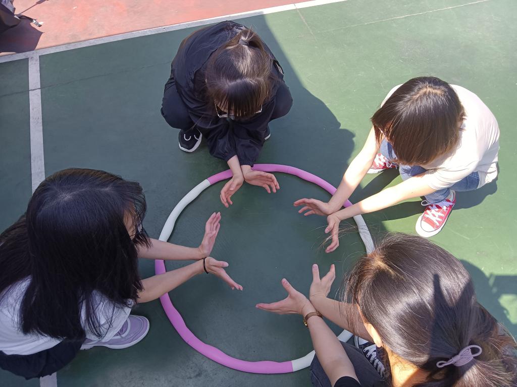 这里举行的是跳绳呼啦圈比拼活动,每个队伍首先进行跳绳,两人摇绳,两人跳绳,接着继续呼啦圈游戏,四个人手拉手通过呼啦圈。游戏充满趣味性并且增加了每个队伍的凝聚力和团队意识。