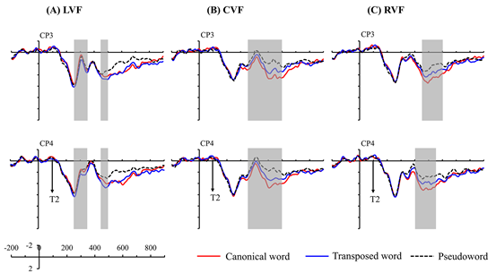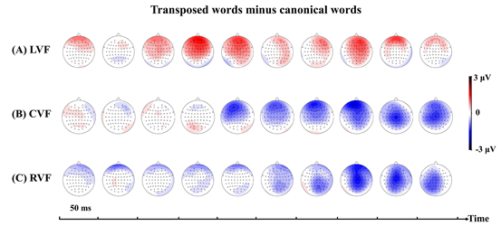语言认知及语言应用研究基地曹洪文副教授团队的研究论文“Electrophysiological correlates of character transposition in the left and right visual fields”,报道了该团队采用事件相关电位技术(event-related potential, ERP)研究左右视野中词素位置加工的认知神经机制所取得的重要进展。研究发现:当目标词语呈现在中心视野(centrally presented visual fields, CVF)和右视野(right visual fields, RVF)的时候,N400的波幅会减小;此外,相比于复合词而言,词素位置颠倒的词语诱发了更大的N400波幅和更小的LPC波幅,该结果显示词素位置颠倒会影响整词语义信息加工。论文通讯作者是曹洪文副教授,第一作者是曹洪文老师指导的博士研究生张二虎。