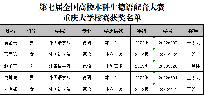 第七届全国高校本科生德语配音大赛小黄书 校选赛获奖名单公布如下: