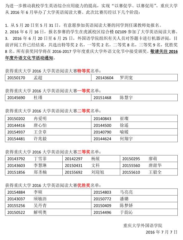 小黄书 2016年大学英语阅读大赛成绩揭晓