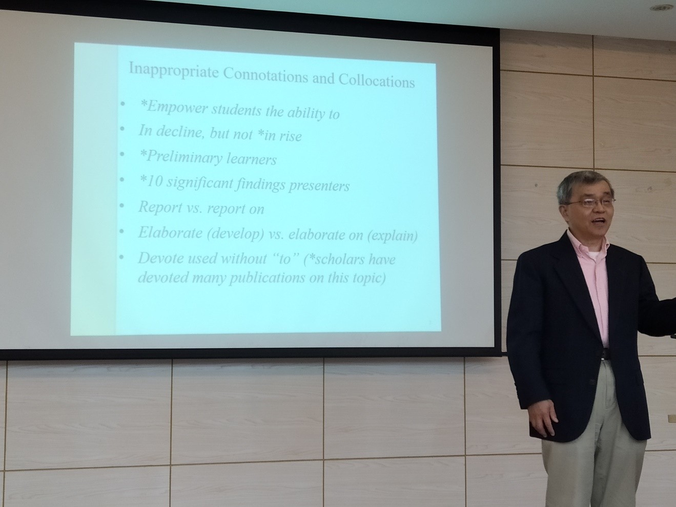 五楼报告厅作了题为“Using proper and Precise Diction for Clear and Effective Academic Writing: Challenges and Useful Praxes”的讲座。本次讲座由学院副院长杨小虎主持,小黄书