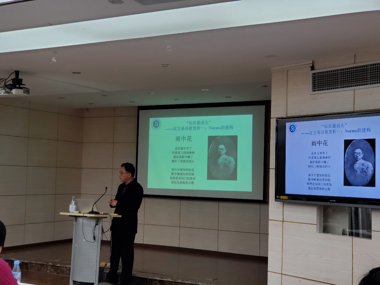 接下来,张旭教授分享了个人在不同时期的著译成果,如《中国英诗汉译史论》(2011)、《一门学科之死》(2014)、《心田的音乐:翻译家黎翠珍的英译世界》(2019)等。随后,张旭教授引用了霍姆斯在翻译学中所作的总体框架,进而谈到研究方法。在目前基础科学很难取得重大突破的背景下,工科学校的外语学院可借助交叉学科,采用归纳法进行研究。对于目前中国翻译研究界的研究者(尤其是初学者),研究建议从小处着手,即“自下至上”的研究模式。此外,张旭教授通过案例分析,指出学生论文选题切勿过于宽泛;通过赏析沈宝基的诗歌,阐述Norms的建构;通过分享自己学生进行诗歌翻译的实验过程,传达交际语言教学的基本理念,以及获得的启示。张旭教授提到,语言学习是一个动态的交际过程,它通常是在具体的语境中进行的。语言的学习同时也是一个认知过程,高级英语的学习也不例外。在认知-交际教学模式中,可以增进对于师生角色的重新认识。张旭教授在本次分享结束时,强调学生做学问、做事,老师做研究、教学等过程中,都需要发扬“唯美主义”的认真、用心精神。