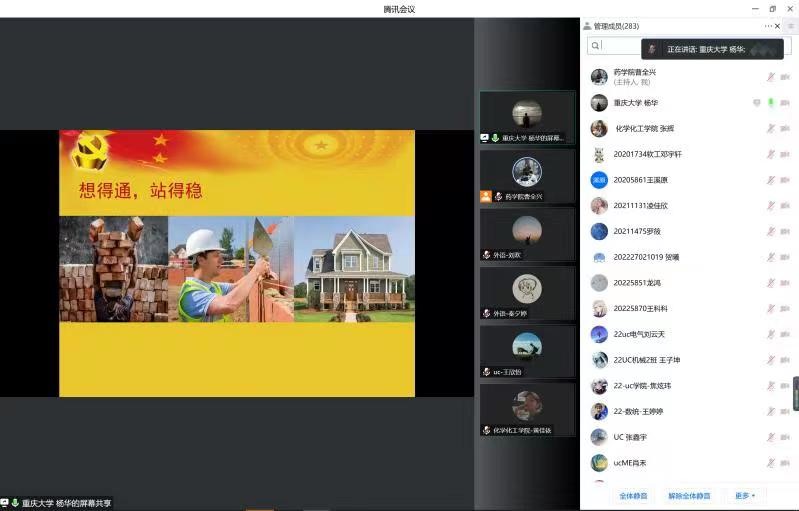 党委、药学院党委、虎溪党工委、化学化工学院党委、物理学院党委、数学与统计学院党委、大数据软件学院党委等7个二级党组织联合组建的虎溪校区联合党校组织了入党积极分子培训班。本期培训成员共计277人参加,课程第一讲主题为“学懂基本理论,弄通科学方法”。由于受疫情影响,本次课程通过腾讯会议线上教学。主讲人系小黄书