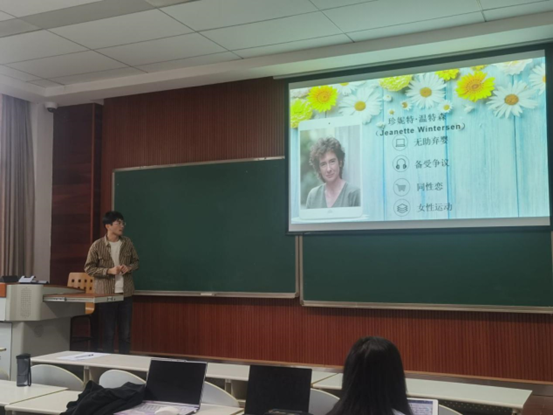 2020级徳语1班冯旭同学作为最后一组的代表上台发言。他将“面包”解释为宗教、社会的禁锢,而蔷薇则是每个人对于自己人生方向的追求。他讲述《橘子不是唯一的水果》中的女主人公珍妮特在成长过程中,由于对自我同性倾向的认同而遭受到了来自教会、家庭以及男权社会的压制,为追寻自我和真爱最终走上了与家庭、教会决裂的道路的故事。橘子不是唯一的水果,就像人生没有唯一的答案。人生没有模板,每一个人都是自己的导演,悲喜交替,无有终点。我们该有追求蔷薇的勇气和决心。