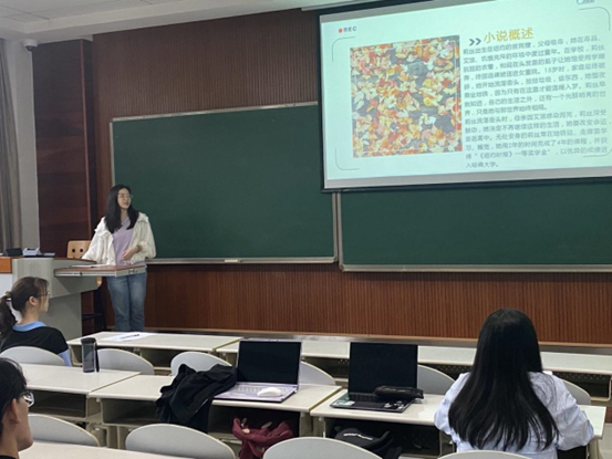 2021级英语3班向媛同学作为第一组的代表,分享了自己阅读《月亮与六便士》时的摘抄:“在满是六便士的大街上,抬头看见了月亮。”她坚信在庸常的物质生活之上,一定有更为迷人的精神世界。尽管古往今来,面包与蔷薇一直是极其困难的人生抉择。但向媛同学认为:“为美而献身比为面包而活要幸福得多。”正如《月亮与六便士》中的那一轮皎皎明月,能够慰贴人们的心灵。