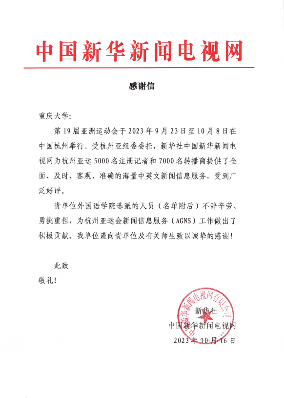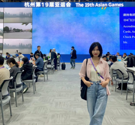 2023级英语笔译专业研究生任莲洁同学以新华社中国新华新闻电视网记者的身份,参与杭州亚运会新闻信息服务(AGNS)工作,在亚运舞台上展现了重大人的风采。
