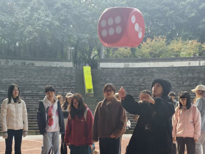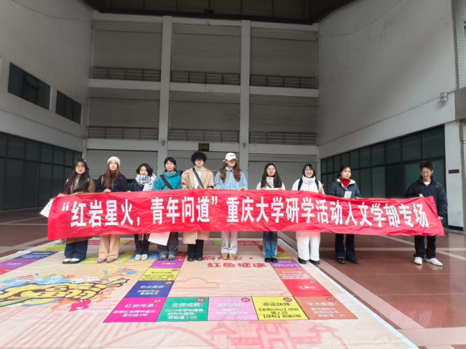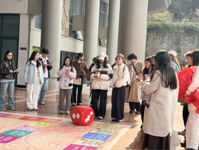 在风雨广场,研学团开展了“知识大富翁”的趣味活动。该游戏将重大校史与同学们的学习生活生动有趣地结合在了一起,通过积分制的方式决出胜负,借着欢乐的活动氛围,让同学们在互动中加深集体感情,在了解校史故事中强化认知、传承校园精神。
