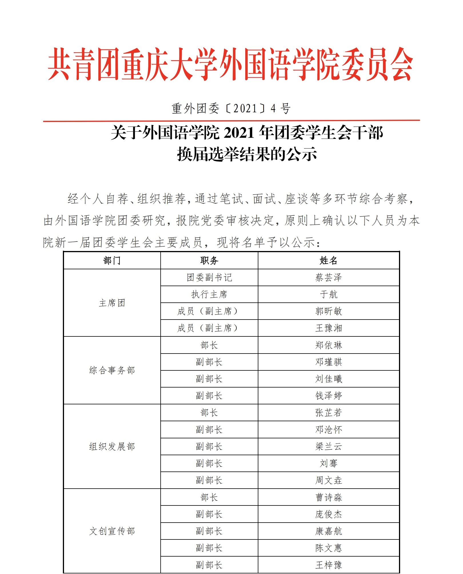 关于小黄书 2021 年团委学生会干部 换届选举结果的公示