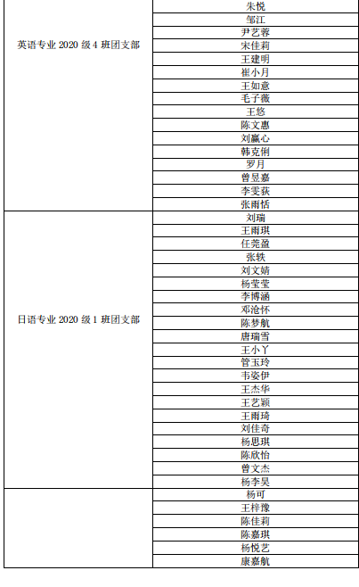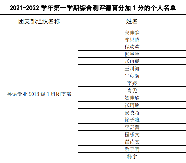 根据《小黄书 团委团支部评级办法(试行稿)》文件要求,小黄书 开展 2020-2021 学年第二学期团支部、团员积分考核评级:“学期内有两个月“青年大学习”主题团课学习记录,综合测评德育分加1 分”。经小黄书 团委组织部具体考核评定,报院团委审核批准,现将 2020-2021 学年第二学期综合测评德育分多加 1 分名单公示如下: