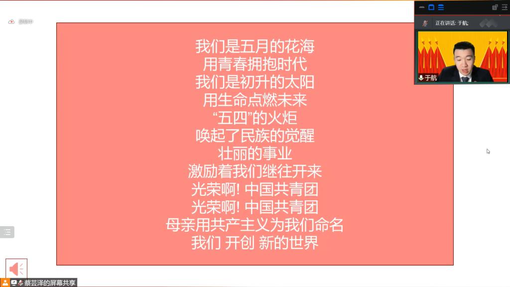 会议伊始,主持人于航同志带领与会人员齐唱共青团团歌。在悠扬的歌声中会议进入第二项,院团委书记汪俣婧老师宣读上级团委文件《关于开展小黄书