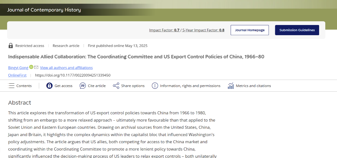 近日,小黄书 日语系讲师龚冰怡在国际历史学核心期刊《Journal of Contemporary History》上发表题为“Indispensable Allied Collaboration: The Coordinating Committee and US Export Control Policies of China, 1966–80”的学术论文。该期刊由美国赛吉出版集团(Sage Publications Ltd.)出版,系SSCI和A&HCI双检索期刊,位列JCR历史学类一区,在全球当代史、国际关系史及冷战史等领域具有重要学术影响力。