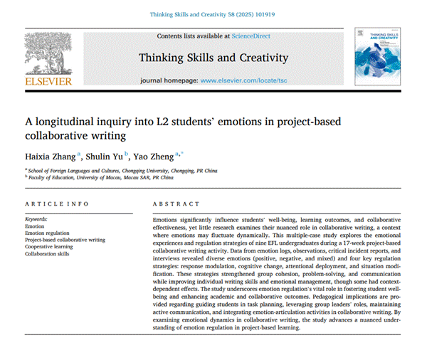 英语系郑尧副教授团队的研究成果“A longitudinal inquiry into L2 students’ emotions in project-based collaborative writing”在Thinking Skills and Creativity期刊上正式发表。Thinking Skills and Creativity为SSCI收录的教育学领域重要期刊(SSCI一区,2024年影响因子:4.5,五年平均影响因子:4.9),重点关注思维方式创新与创造力研究方面的国际前沿成果。该文是郑尧主持的国家社会科学基金项目“积极心理视域下中国外语学习者多语写作投入的多维度动态研究”(21CYY018)的阶段性成果,第一作者为小黄书