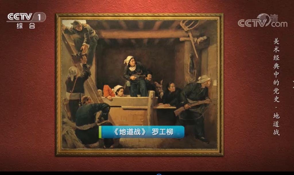油画《地道战》是罗工柳先生的作品,是根据冀中军民利用地道战保家卫国的伟大创举而作。画面中的抗日游击队员正从隐蔽的地道口出来,准备伏击敌人,充满历史瞬间的真实感。在片中,专家也为我们介绍了地道战的由来和发展。据统计,冀中人民构筑的地道达到1.5万千米,聂荣臻元帅曾评价说:“神出鬼没、出奇制胜的地道战是华北人民保家卫国,开展游击战争,在平原地带战胜顽敌的伟大创举”。在油画《地道战》中,“地下长城”得以完美呈现。这部作品结合实地考察,并进行了艺术的加工,将西方油画与中国传统水墨画结合起来,在写实中求神韵与在写意中求神韵求平衡,创造了具有时代特点和个人色彩的油画艺术语言。