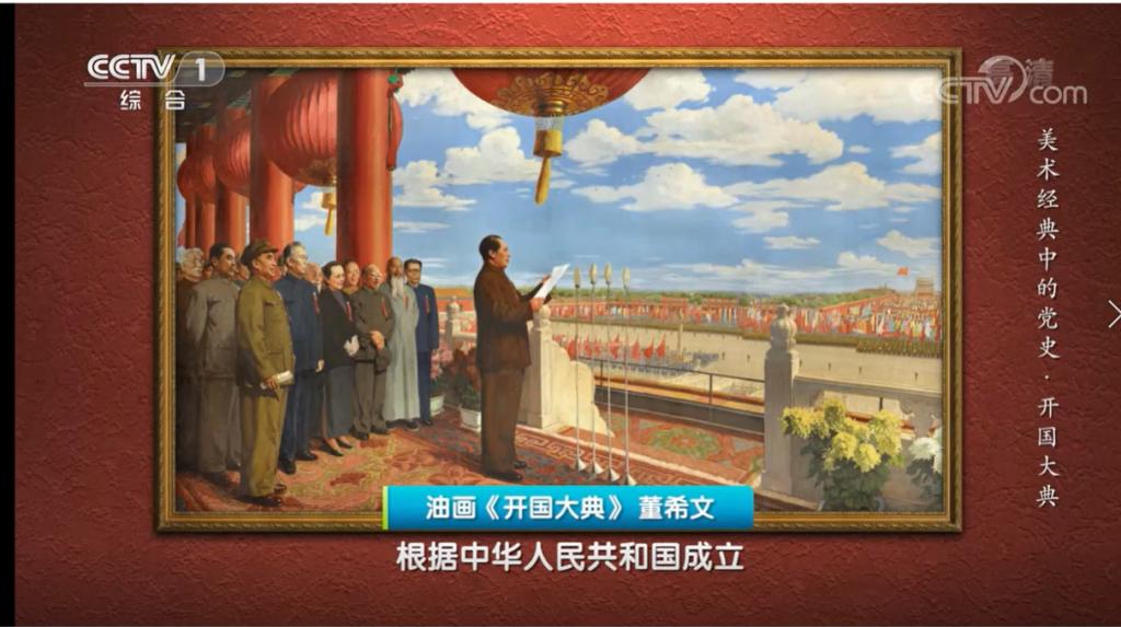 “中华人民共和国中央人民政府,今天成立了!”,伴随着这一激动人心的画面重现,节目组为我们讲述了油画《开国大典》背后的故事。1952年,画家董希文根据中华人民共和国成立这一载入历史史册的重要事件,创作了油画《开国大典》。毛泽东主席魁梧的身姿处于画面的中心,显示出他领导我们党、领导我们全国各族人民的核心地位。为了体现开国大典是人民的伟大胜利,董希文把领导人员和台下的人民群众囊括在一起,形成了“大团圆”构图。创作过程中,董希文老师为了解决画面构图不开阔的问题,大胆的“去掉廊柱”,为此,他还曾专门请教了几位建筑学家。梁思成先生曾经这样评价:“画面右方有一个柱子没有画上去,这在建筑学上是一个大错误,但是在绘画艺术上却是一个大成功。”最终,经过两个多月的创作,董希文老师完成了油画《开国大典》。这部作品也被誉为“共和国成立的艺术见证”。