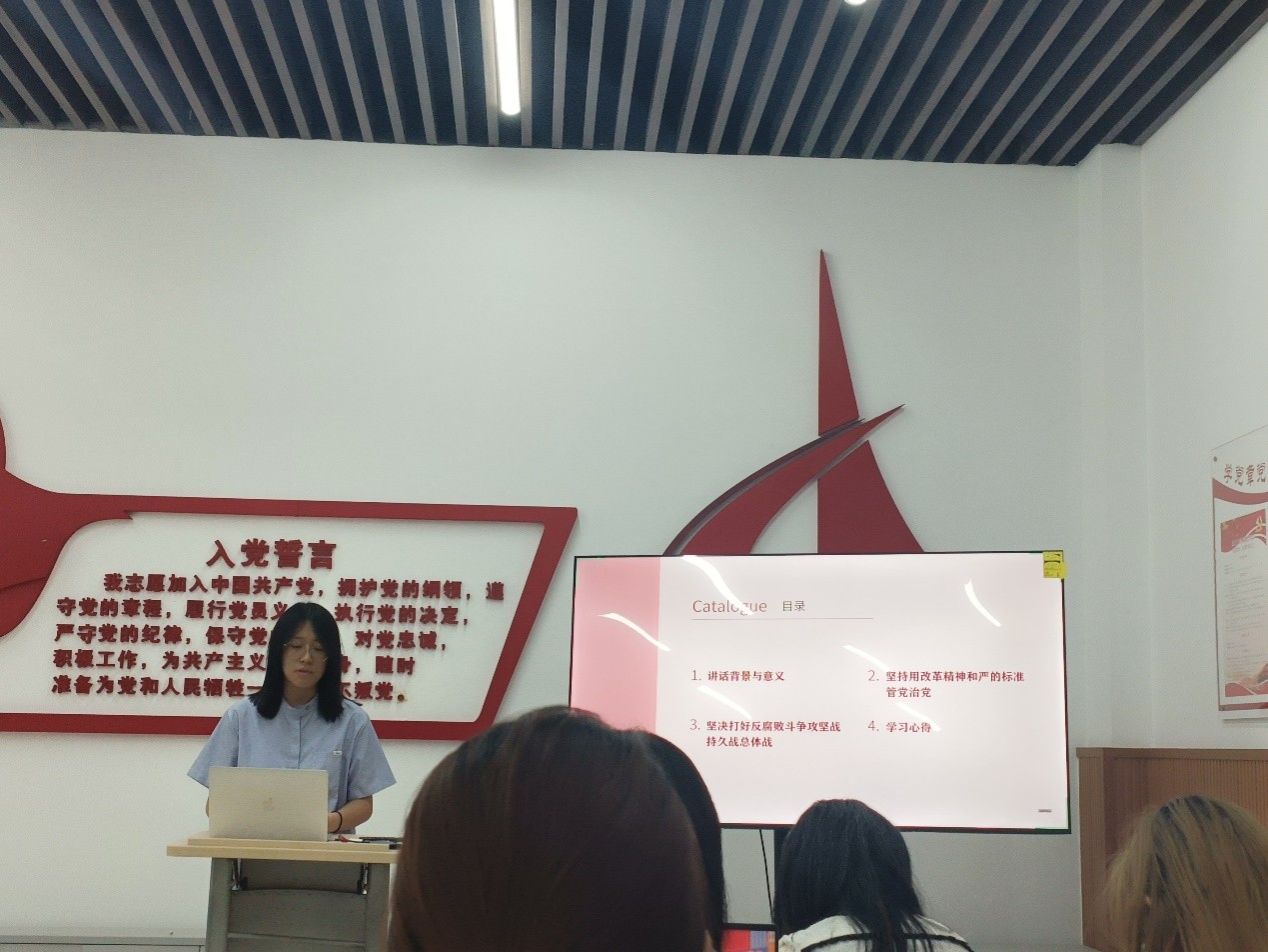 会议第二项议程是由张赢方、戴兰同志分别对“习近平在二十届中央纪委三次全会上发表重要讲话强调:深入推进党的自我革命,坚决打赢反腐败斗争攻坚战持久战”、“习近平在二十届中央纪委四次全会上发表重要讲话强调:坚持用改革精神和严的标准管党治党,坚决打好反腐败斗争攻坚战持久战总体战”进行解读。两位同志结合个人实际,深入解读了文件精神。张赢方同志从“要加强党对反腐败斗争的集中统一领导”、“要持续保持惩治腐败高压态势”、“要深化改革阻断腐败滋生蔓延”、“要进一步健全反腐败法规制度”几个方面深入浅出地为在座党员同志解读了文章内容。戴兰同志则从“讲话背景与意义”、“坚持用改革精神和严的标准管党治党”、“坚决打好反腐败斗争攻坚战、持久战、总体战”三个方面解读了文章内容,抓住“全面从严治党”、“坚决惩治腐败”、“加强作风建设”三个要点勉励在座党员同志要弘扬党的光荣传荣、不忘初心。