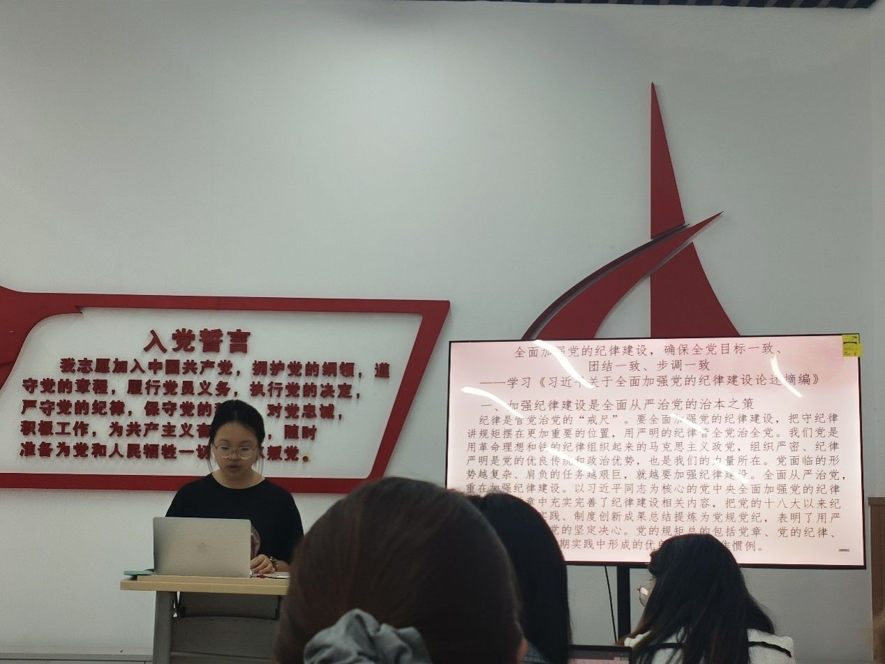 党的作风就是党的形象,关系人心向背,决定党和国家事业成败。习近平同志围绕加强党的作风建设发表的一系列重要论述,立意高远,内涵丰富,思想深刻,对于持之以恒正风肃纪,锲而不舍落实中央八项规定精神,以钉钉子精神纠治“四风”,推进作风建设常态化长效化,保持以党的自我革命引领社会革命的高度自觉,坚持用改革精神和严的标准管党治党,确保党始终成为中国特色社会主义事业的坚强领导核心,推动中国式现代化行稳致远,具有十分重要的意义。会上组织支部党员结合《习近平关于全面加强党的纪律建设论述摘编》内容,认真学习领会习近平总书记有关重要论述,引导学生党员学纪、知纪、明纪、守纪,真正把纪律规矩转化为政治自觉、思想自觉、行动自觉,推动全面从严治党向纵深发展,为以中国式现代化全面推进强国建设、民族复兴伟业提供坚强纪律保障。