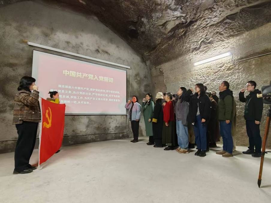 在庄严肃穆的防空洞内,全体党员重温入党誓词。誓言回响,进一步坚定了大家坚守教育初心、潜心教书育人的使命担当。