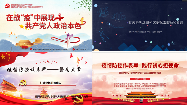 会议由暨南大学国际关系学院华侨华人研究院2019级党支部书记何琴主持,她首先介绍了本次联合党课主要议程:疫情防控做表率主题分享、践行初心担使命主题分享和美好希冀三个部分。三个支部的代表分别就每个话题进行了分享。学硕一支部的张震宇同志向大家分享了疫情期间如何高效利用各种网络工具进行课题研究;彭港平同志就学校、学院的返校复课保障以及疫情期间支部理论学习和活动开展情况进行了分享和交流;邓雨婷同志结合自身专业优势介绍了英语学习的“干货”、相关疫情英语表达以及外事志愿服务中应该注意的跨文化交流注意事项。同时,国际关系学院的同志也分享了全球疫情下华侨华人的工作、生活现状以及人类命运共同体视角下的海外抗疫统一战线。