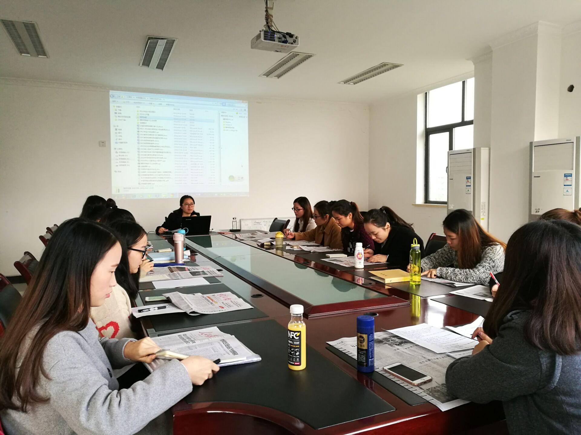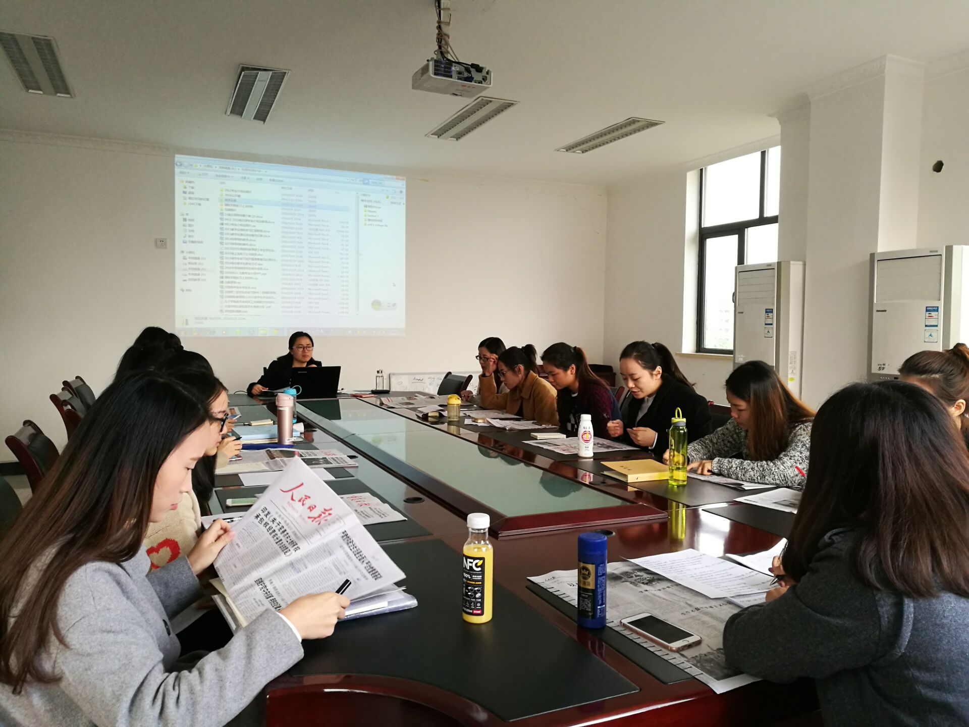 学习会上,同学们阅读认真仔细,一边阅读一边在报纸上勾画重点,总结要点。发言时,每个人畅所欲言,兴致勃勃地讲述着对精神的领会和自己在接下来的学习、生活中的践行打算。