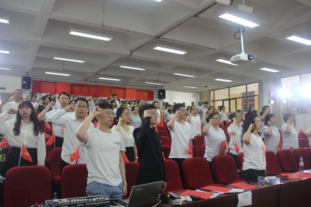 在活动的最后,党委书记欧玲带领全体党员一起重温入党誓词,大家齐唱《我和我的祖国》。活动在浓厚热烈的氛围中结束,在场的师生党员情绪高涨、意犹未尽。学院党委书记欧玲做了总结发言,高度评价了各支部的精彩表演,要求全体师生党员在“两个一百年”奋斗目标的历史节点,要“撸起袖子加油干”,教师党员要认真落实立德树人根本任务,学生党员深入领会习近平总书记对青年立大志、明大德、成大才、担大任的要求,让青春在奋斗中绽放绚丽之花,以优异成绩迎接建党100周年。
