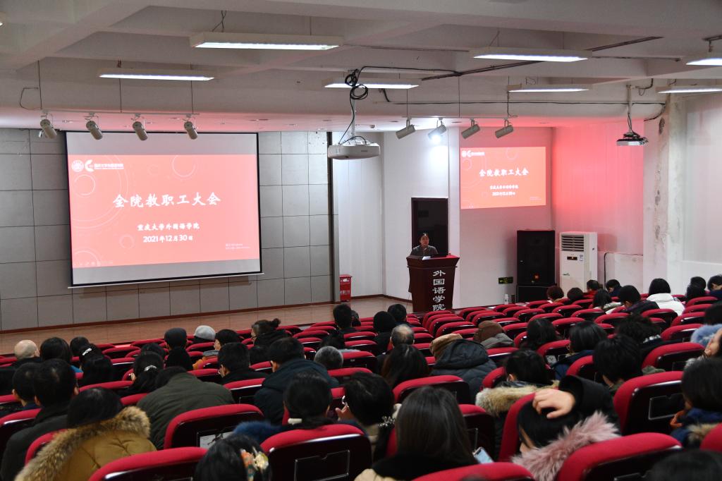 彭静院长代表学院领导班子做了题为《提质增效 争创外国语言文学一流学科》的述职报告,向大家汇报了一年来学院在师资队伍建设、人才培养、学科建设、国际合作与交流等方面所取得的喜人成绩。2021年在学校党政的正确领导下,学院党政班子团结带领全院师生员工齐心协力、迎难而上,各项工作取得显著成绩。彭静还就个人履职情况作了汇报。