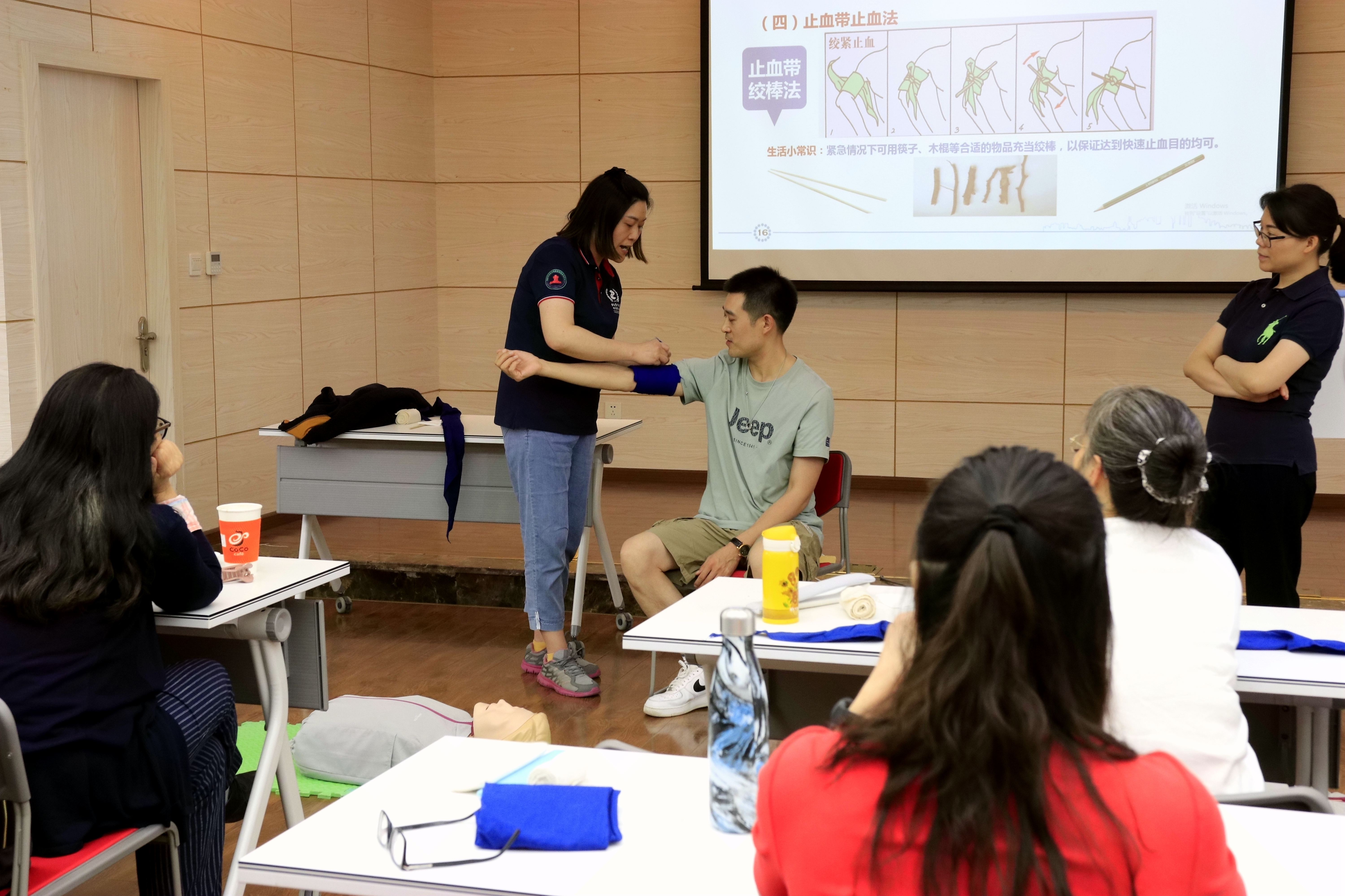 下午,方艳老师和龙清艳老师又详细讲解了对伤者意识形态评估、止血方法、包扎技术、伤员转运技术等相关知识和技术要点。培训教师讲课诙谐幽默,志愿者学生耐心服务,参训教职工专心听讲、认真练习实操,6个小时的培训内容干货满满,大家受益匪浅!