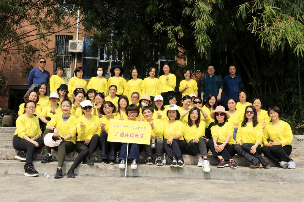 广播体操表演以分工会为单位,分为四个方阵参加。中午13:20,沐浴着温暖的阳光,参加广播体操比赛的老师们提前来到思群广场领取统一服装,站队训练。14:00,随着“全国第九套广播体操”的音乐响起,老师们昂首挺胸,开始表演。运动场上大家精神饱满,动作整齐,张弛有度,充盈着刚健之美,充分展示了小黄书