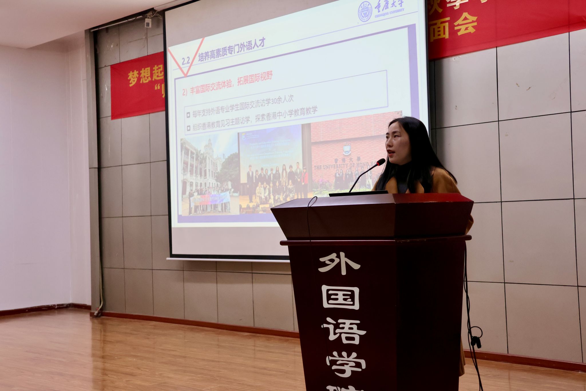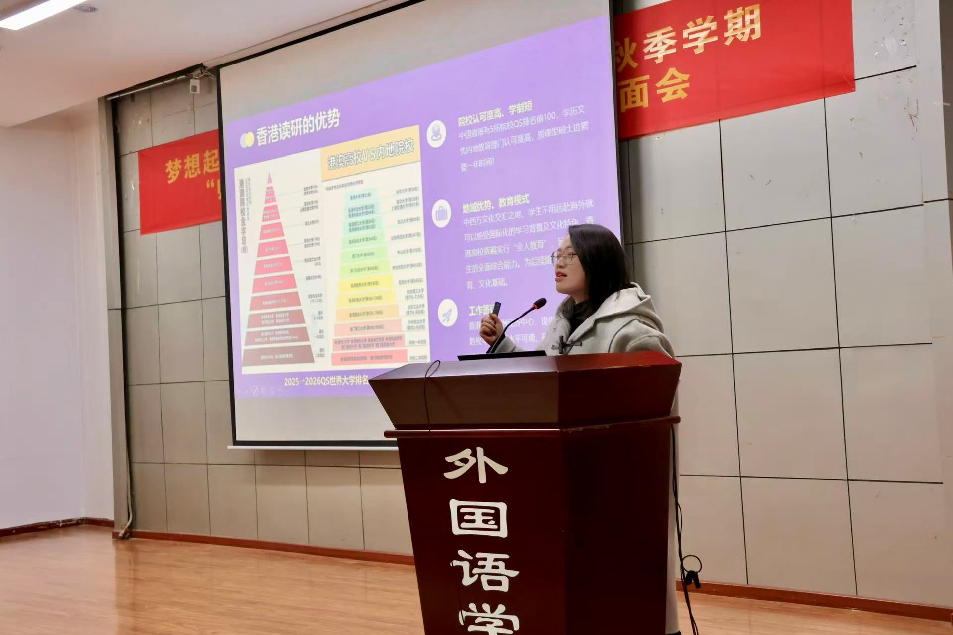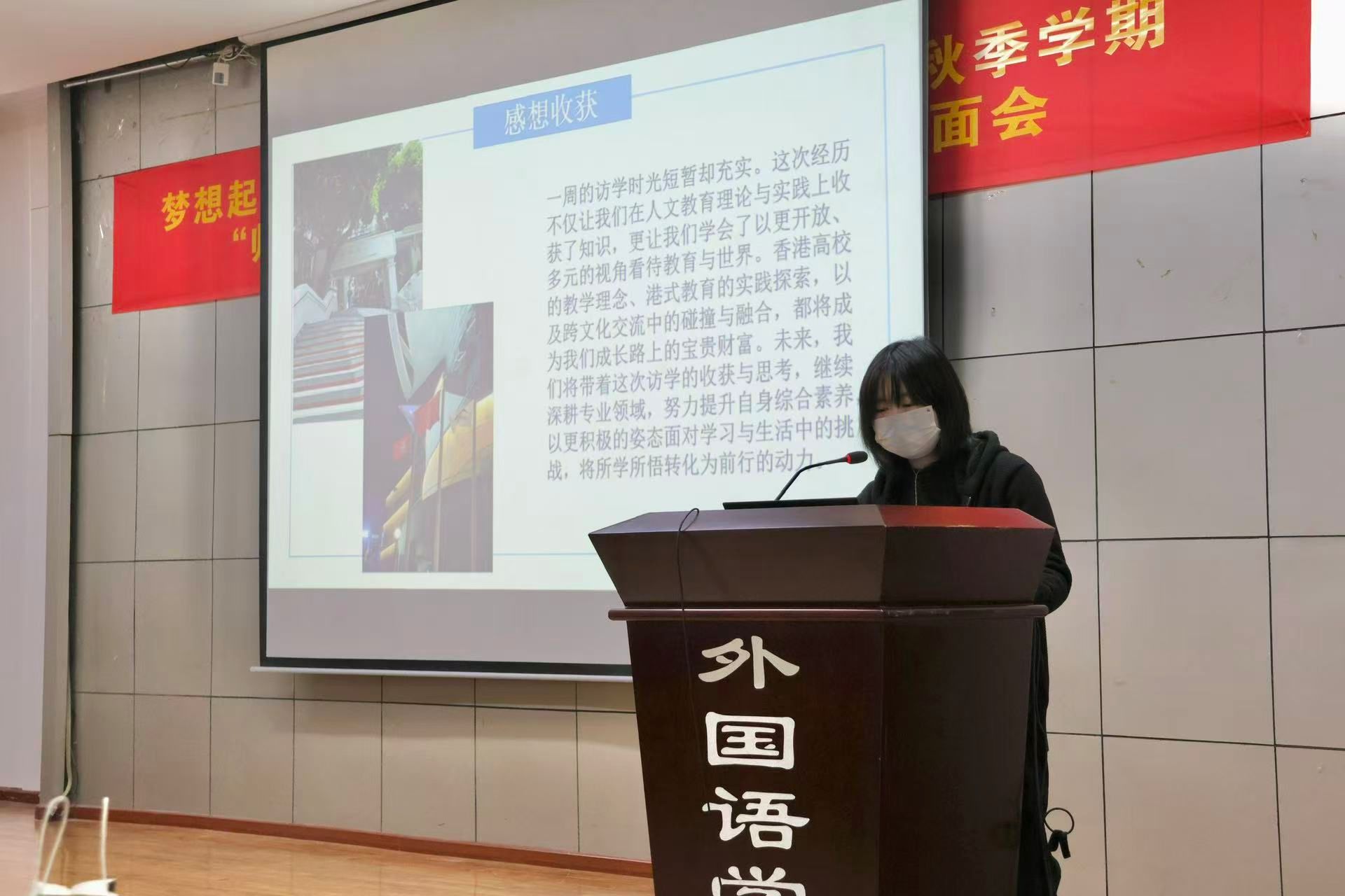 随后,艾佳华老师介绍了香港大学教育见习访学项目的课程设置、活动安排以及费用支持政策。曾参与该项目的匡蕾瑾同学结合自身经历分享了学习收获与生活体验,为在场同学提供了生动参考。