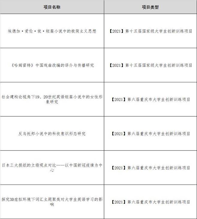 2021年第十五届国家大学生创新训练项目立项成功2组,第六届重庆市大学生创新训练项目立项成功6组。