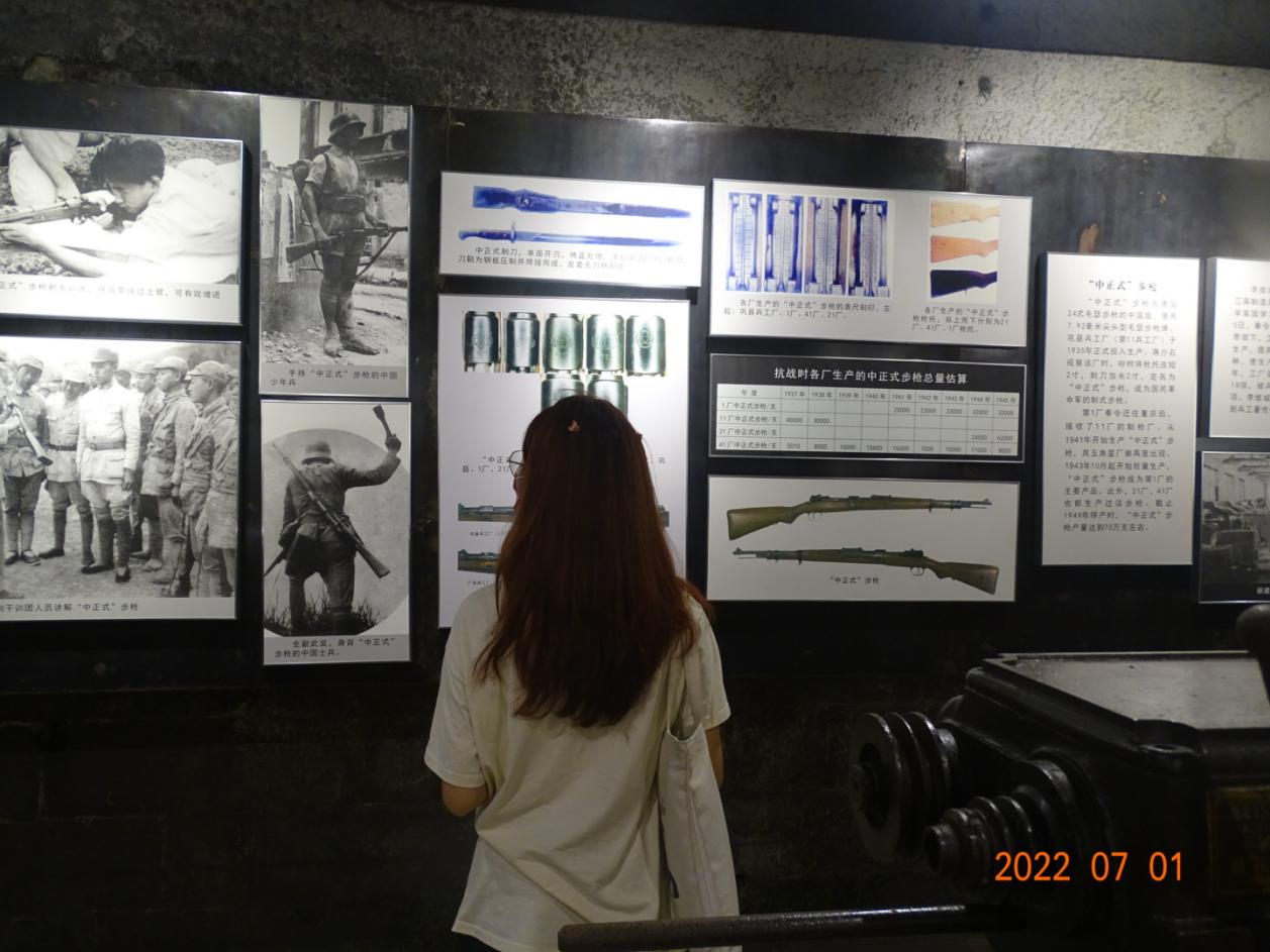 7月24日上午9时,实践团前往回望红岩足迹的第三站——重庆建川博物馆,进行参观学习。重庆建川博物馆是一个由24个防空洞打造的8个博物馆组成的博物馆聚落,包括兵工署第一厂旧址(汉阳兵工厂)博物馆、抗战文物博物馆等主题博物馆。其中,各式各样的老牌步枪、实景还原的抗战时期制造兵器的场景吸引着实践团成员的视线。这些丰富的文物和文字资料加深了实践团成员对抗战时期重庆军事力量的了解。实践团成员们在参观过程中不由得感叹道,“过去我们与敌人军事力量差距那么大,但在几代人的努力后,现在中国每年的阅兵仪式都能让世界为中国军事力量的强大而深感震撼。”