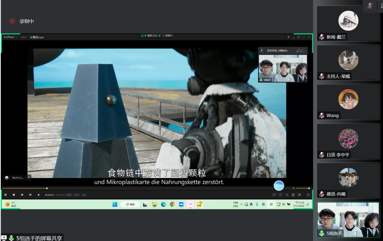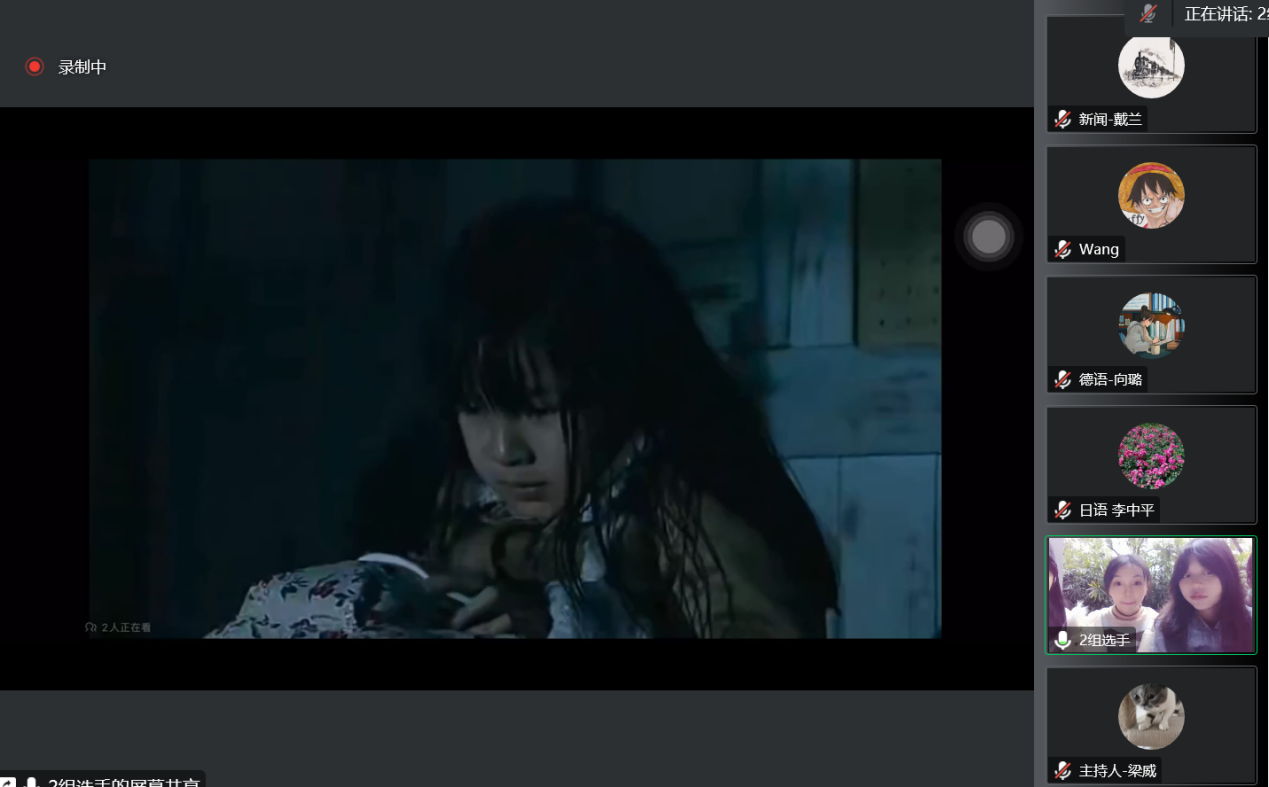 日语、德语专业。同时此次比赛还唤起了其他专业同学对小语种的兴趣,可喜可贺。他们的选材或恰当关注社会亲情类话题,重新唤起人与人之间对于情感的渴望;或着眼于对当今时代人类科技发展,体现对科技道德伦理的反思。在欣赏他们配音表演的同时,也带给观者对于个人、社会、国家三者关系的深入思考。