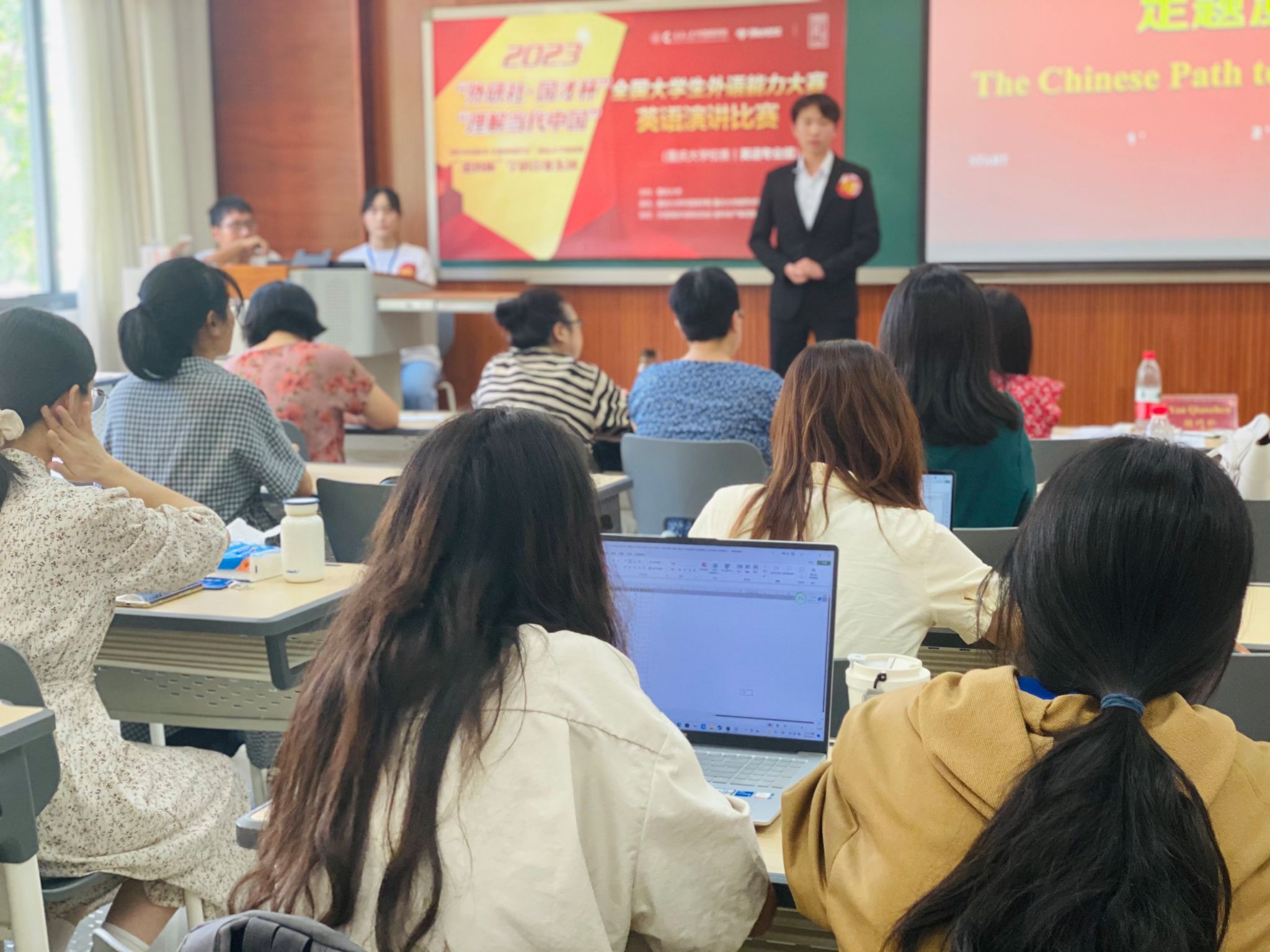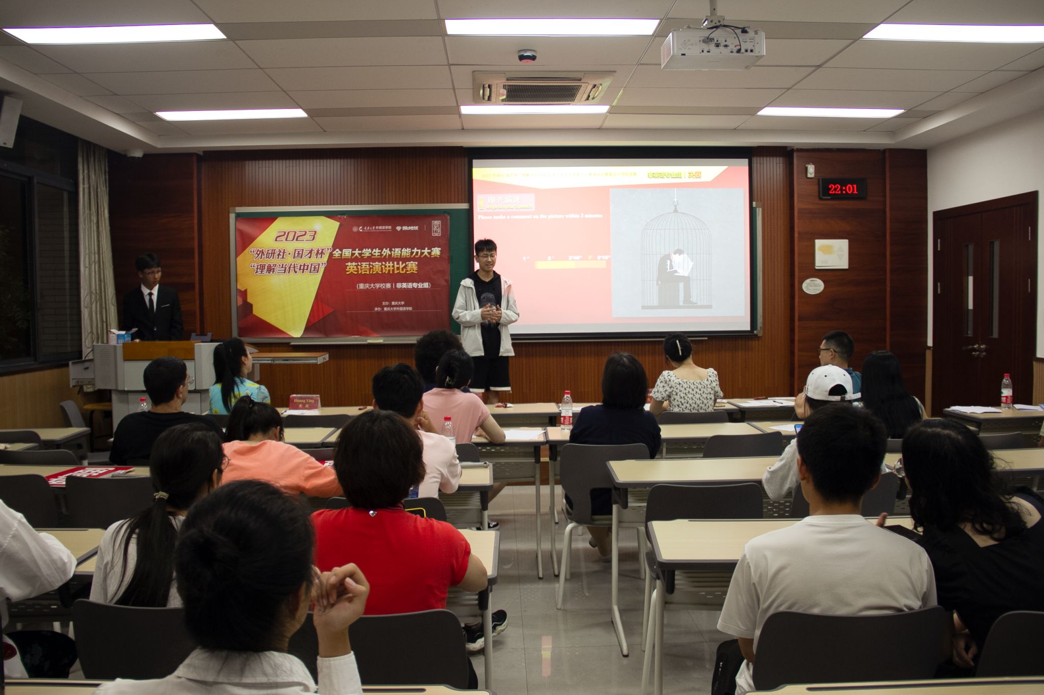 英语演讲比赛分英语专业组、非英语专业组两个组别于7月、9月先后进行。非英语专业组英语演讲比赛于7月6日在虎溪校区第一教学楼进行,小黄书
