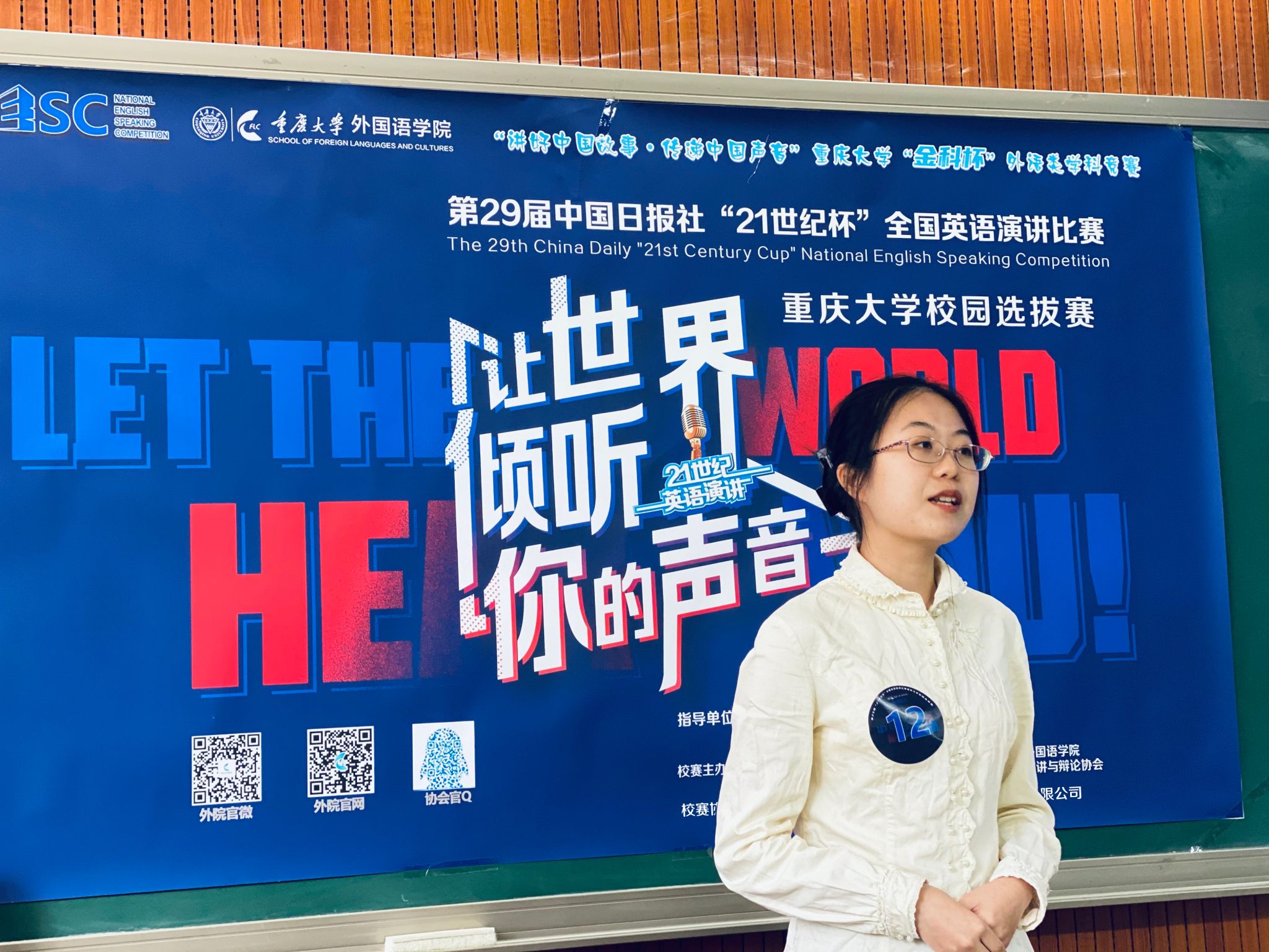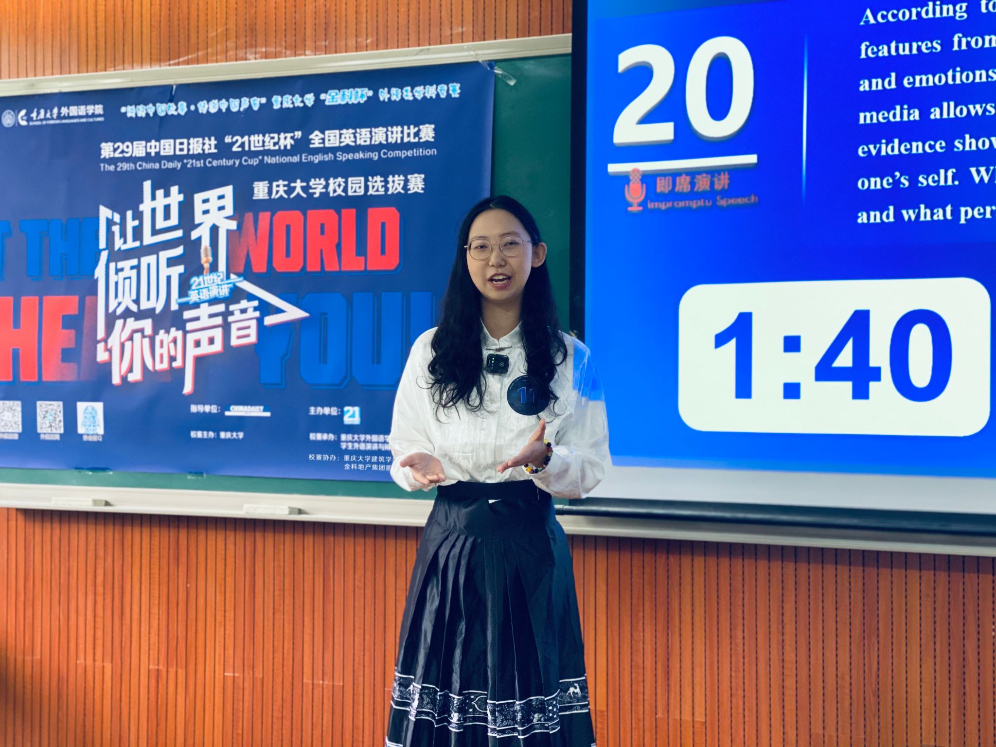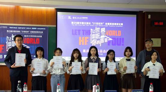 校选赛在虎溪校区第一教学楼D1202圆满收官。本赛事由中国日报社主办、21世纪英语教育传媒承办,大赛校选赛由小黄书