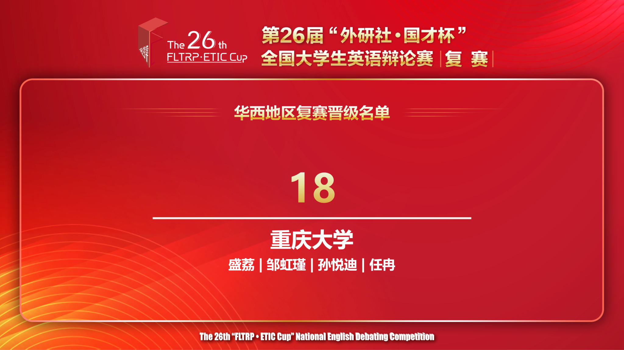 赛程赛况跌宕起伏,在两天五轮的思维角逐碰撞中,我校两位辩手面对每轮辩题审慎分析,掷地有声、平稳应对,其立论反驳中对现实话题之关切,展现了重大学子“复兴民族,誓作前锋”的担当,最终以总积分10分的成绩赢得了国赛入场券。