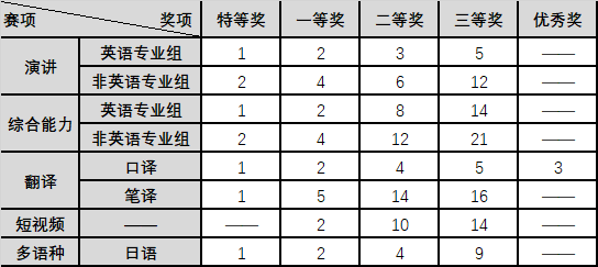 承办,学生外语演讲与辩论协会、英语协会协办。各赛项历时三个月选拔,累计吸引了全校近30个学院超60个专业(类)的近千名外语学习兴趣浓厚的学生参赛逐鹿,评选出192名获奖选手。其中,英语演讲赛项获奖选手35人,英语专业组11人,非英语专业组24人;综合能力赛项获奖选手64人,英语专业组25人,非英语专业组39人;英语口译赛项获奖选手15人;英语笔译赛项获奖选手36人;英语短视频赛项获奖选手26人;多语种类赛项获奖选手16人。