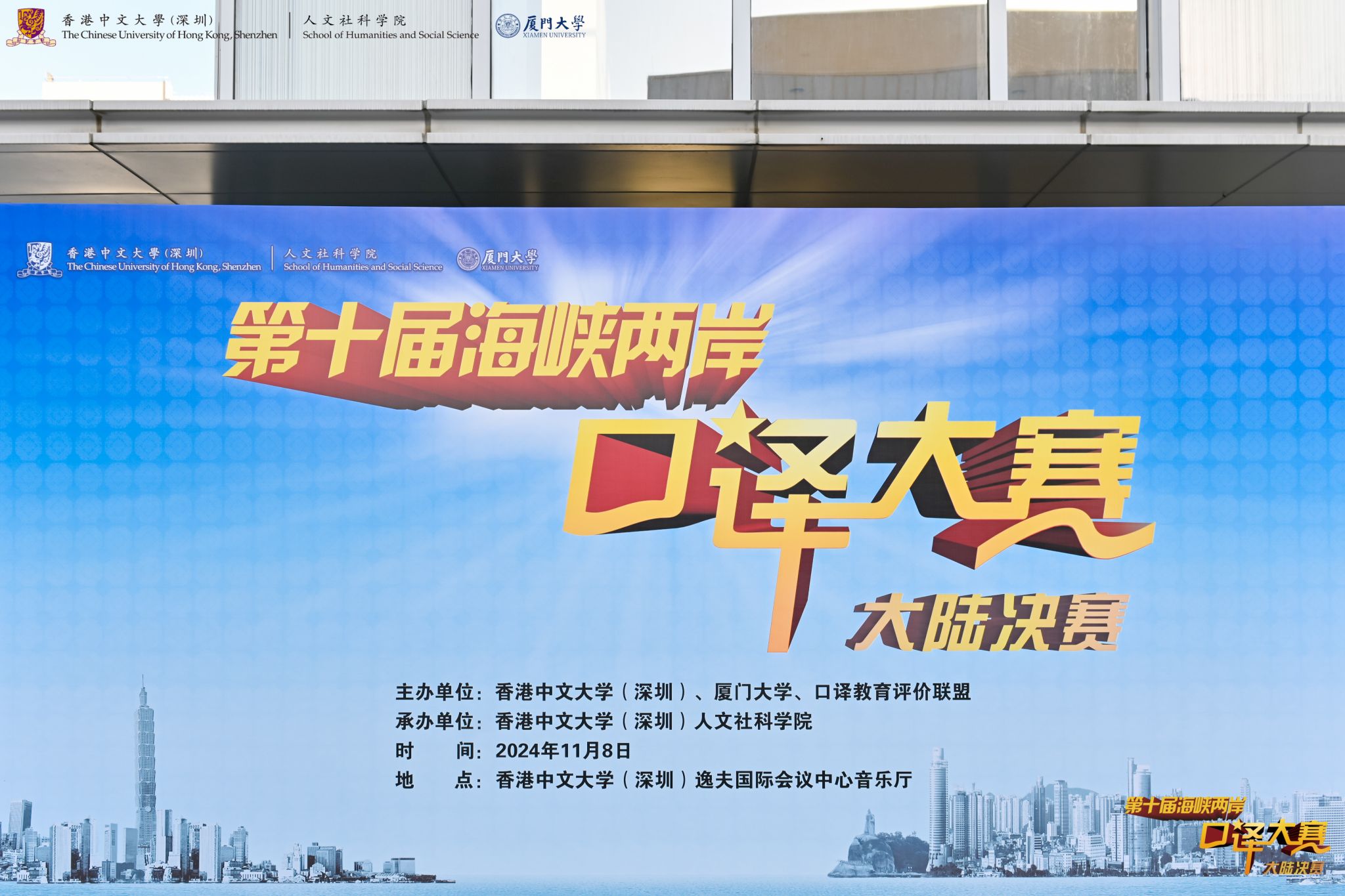 2024年11月8日,第十届海峡两岸口译大赛大陆决赛在香港中文大学深圳校区逸夫国际会议中心音乐厅举行。本次大赛由香港中文大学(深圳)、厦门大学、口译教育评价联盟主办,香港中文大学(深圳)人文社科学院承办。比赛汇聚了来自华中赛区、华东赛区、华南赛区、西南赛区各赛区的晋级选手以及主办方邀请的种子选手。小黄书