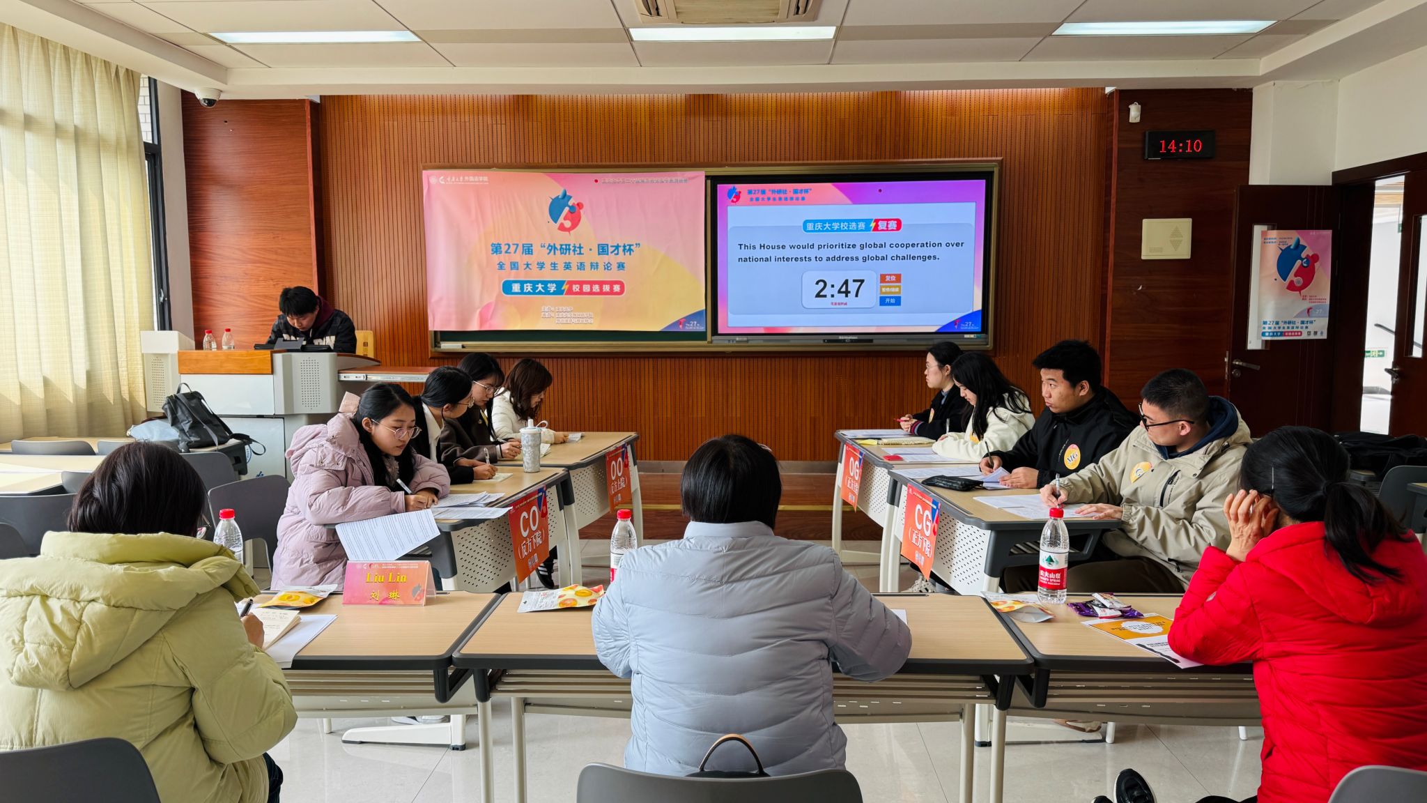 复赛分四个赛场同时比赛,辩手们围绕“This House would prioritize global cooperation over national interests to address global challenges.”这一辩题展开辩论。相较于初赛,复赛对辩题的宏观驾驭能力提出更高要求。经过激烈竞争,各赛场个人得分排名前四的选手共计16人晋级半决赛。