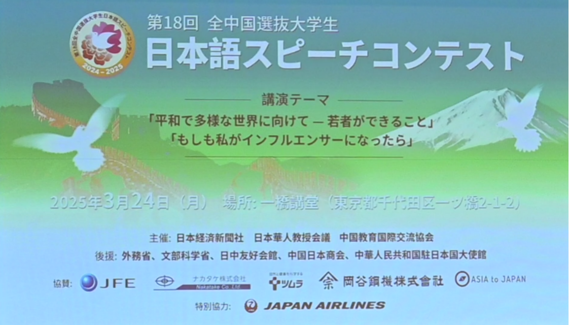 2025年3月24日,第十八届中华全国日语演讲比赛决赛在日本东京一桥讲堂举行。本次比赛由中国教育国际交流协会、日本经济新闻社、日本华人教授会议联合主办,共有284所高校参赛,分为华中、华东、华北、西北、西南、东北、华南7个赛区。通过校选赛、地区赛选拔的16名选手晋级全国决赛。小黄书
