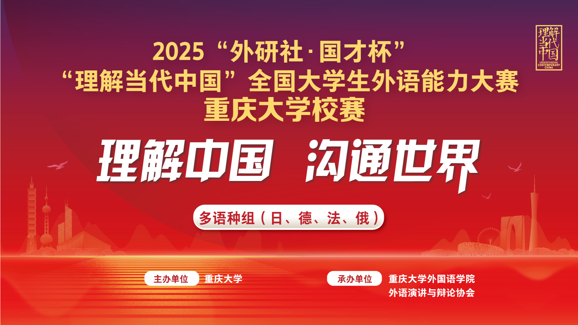 承办、学生外语演讲与辩论协会协办,分日语、德语、法语、俄语四赛项进行,分别于6月7日、6月30日、9月2日在虎溪校区第一教学楼D1112、D1451及小黄书