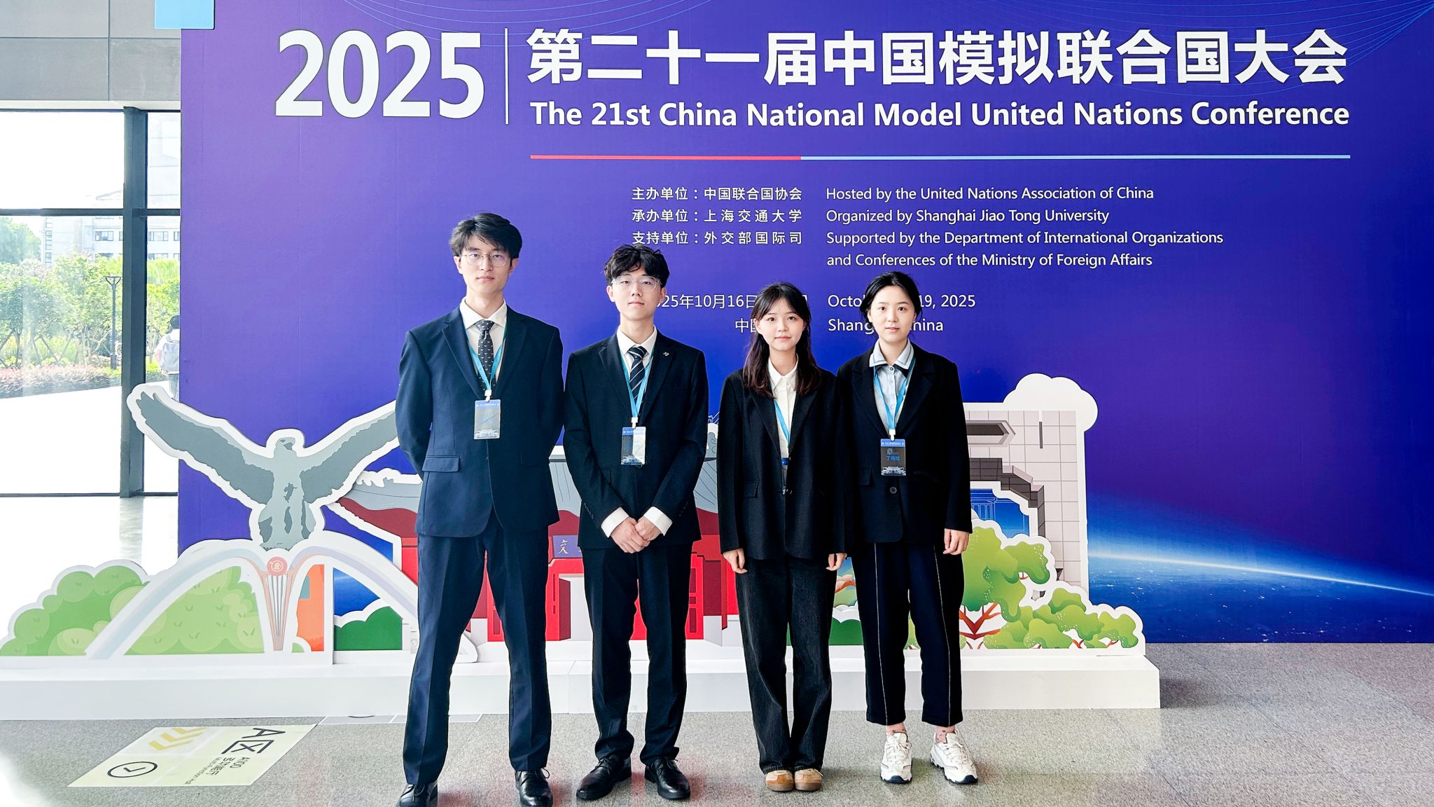 2023级英语专业本科生王瑞、丁雨暄,美视电影学院2023级播音与主持艺术专业本科生郭子谦和光电工程学院2024级测控技术与仪器专业本科生关宇皓4位同学组成,经过四天的紧张会期,丁雨暄获得Outstanding Delegate(杰出表现奖),郭子谦、关宇皓获得Most Potential Delegate(最具潜力奖)。
