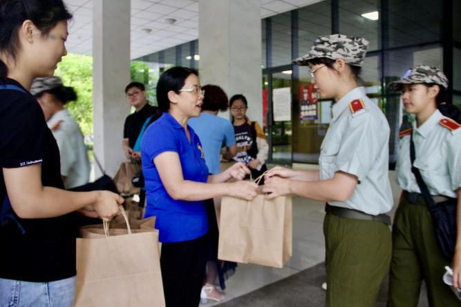 随后,到场的学院领导和老师在学生会成员的协助下向参训的新生们发放了学院精心准备的慰问品,并组织新生们在学院楼架空层的阴凉处原地休息。礼物虽小,心意传递。在递送慰问品的同时,学院领导对各位新生嘘寒问暖,期望同学们在大学生活中能快乐健康地成长。