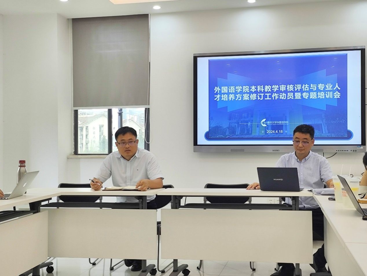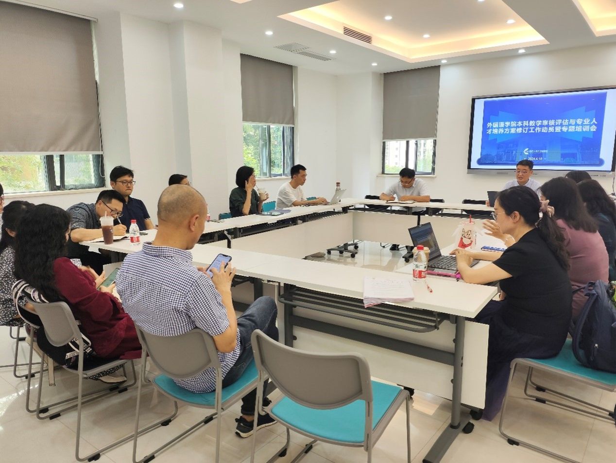 在大外中心A3栋422室召开了本科专业教学管理例会暨本科教育教学审核评估动员会,进一步明确本学期教育教学各项管理工作。参加人员有学院莫启扬院长,英语系、日语系、德语系和国际中文教育系系主任、副系主任和教研室主任,以及学院教学管理人员等近30人现场参会。王江副院长主持会议并做工作部署。