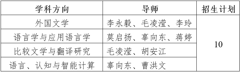 9. 报考“外国文学”“语言学与应用语言学”以及“比较文学与翻译研究”三个方向的考生需提供研究生期间的二外成绩证明或权威社会性考试成绩证明,报考“语言、认知与智能计算”方向的考生须提供英语水平等级证明。