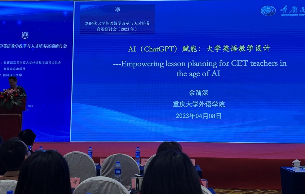 余渭深教授做主旨报告“AI(ChatGPT)赋能:大学英语教学设计”。余渭深教授从ChatGPT的横空出世引出AI应用下的教育重塑,并通过大量的ChatGPT应用的具体案例得出初步结论,ChatGPT能完成教学材料的改写和增添,能对教学内容、教学目标做出符合外语教育学的理解和判断,能对学习任务做出具有专业性的判断等。最后余渭深教授指出以ChatGPT为代表的AI赋能教师的同时,挑战与机遇并存,勉励参会教师提高专业素养,用教育智慧心驾驭人工智能芯。该主旨报告引起了线下线上参会教师的激烈反响。