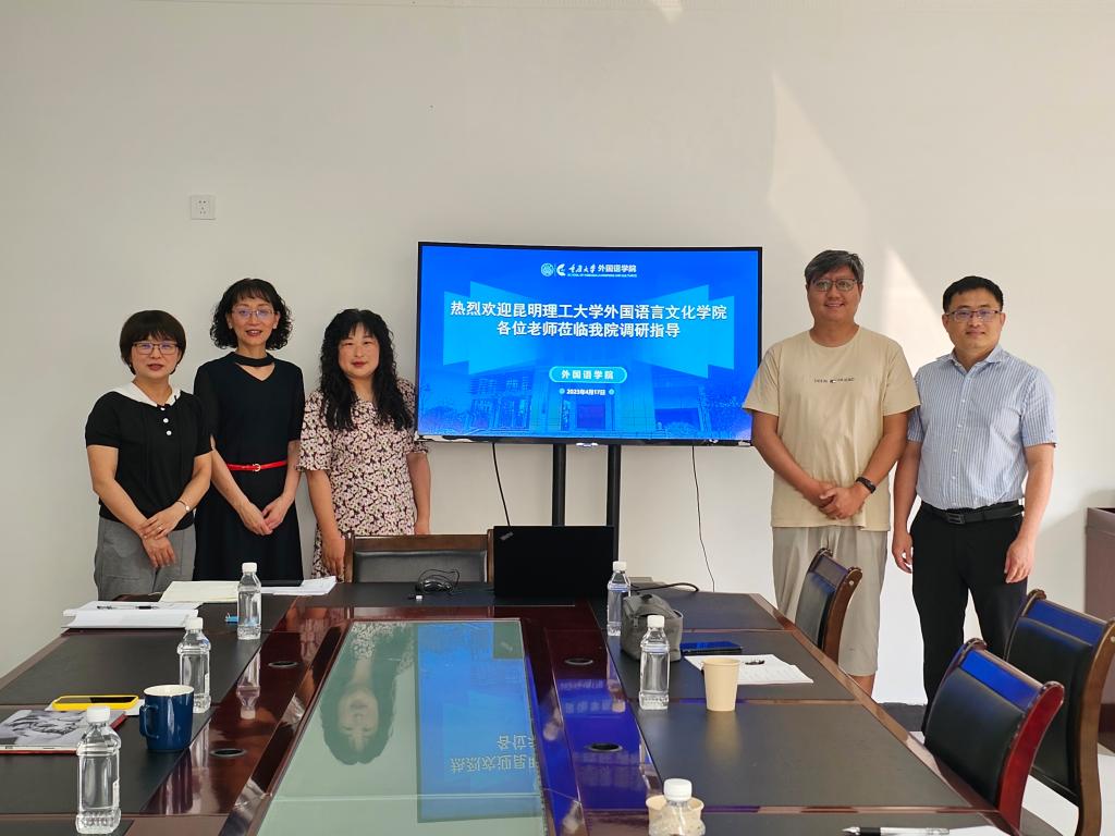 2023417日上午昆明理工大学外国语言文化学院杨玲副院长一行来小黄书 交流访问。欧玲书记和莫启扬院长首先代表小黄书 对杨玲副院长一行来访表示真挚而热烈的欢迎。李小辉副院长、冯玲老师、田雨晗老师与来访教师进行了座谈。