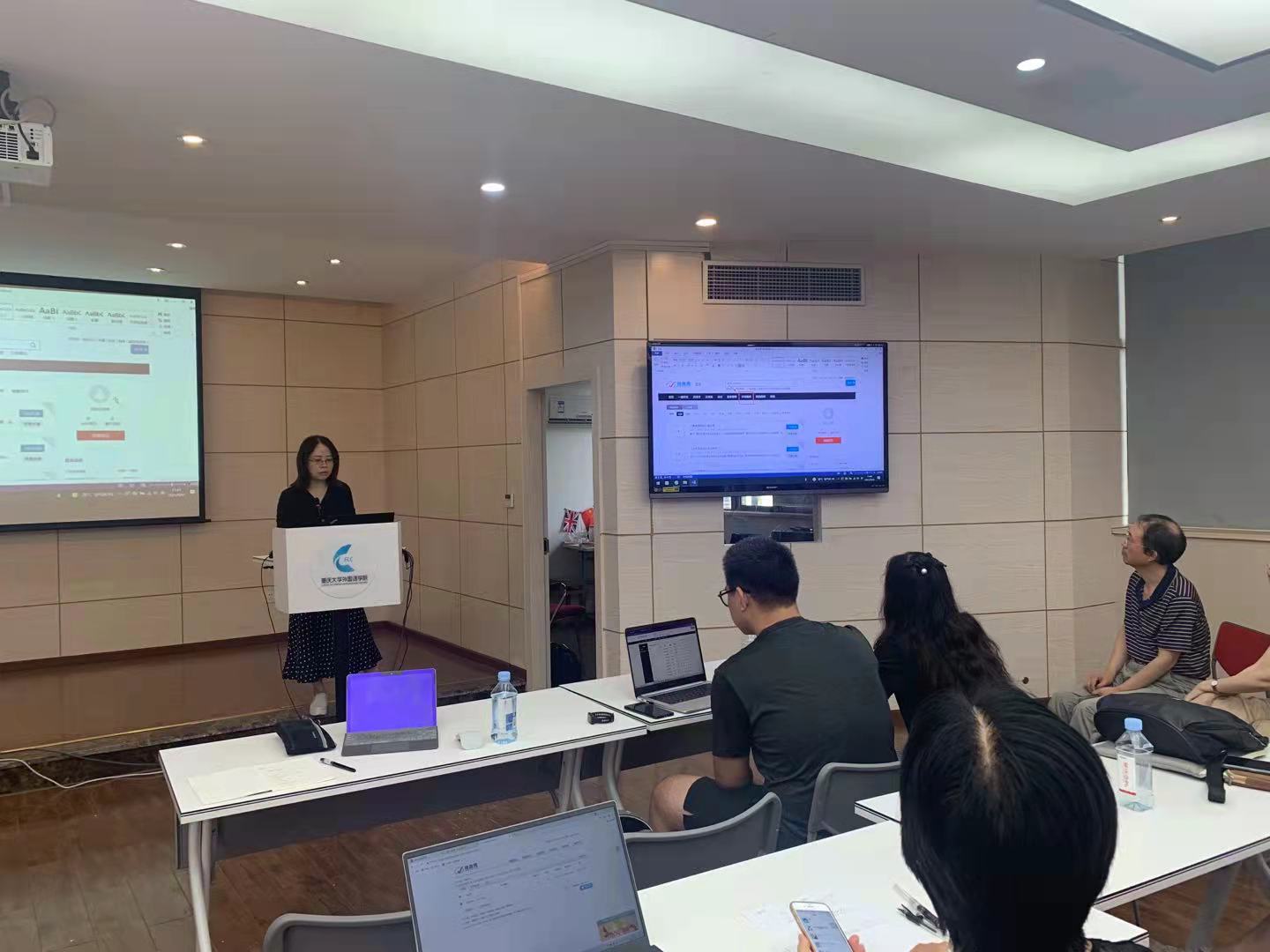 讲座结束后,课程组就数字教学平台的资源建设情况进行集体讨论。周翎老师和刘琳老师各自演示了课程组自建的批改网题库和云班课教学包的使用方法。刘世平老师不仅演示了云班课的操作方法,还制作并分享了演示视频和词汇教学包。