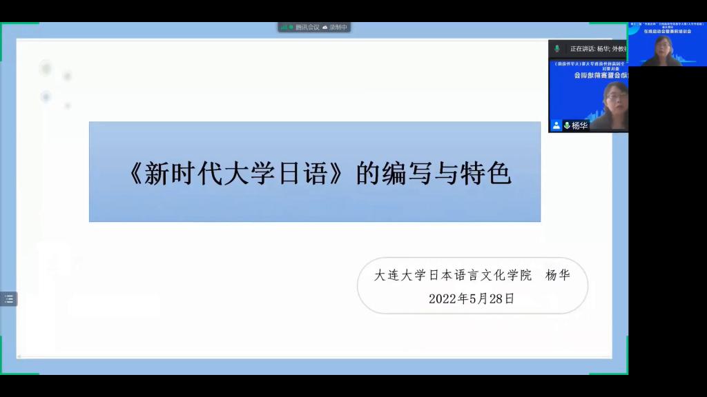 进入会议日语场第二个环节,大连大学杨华教授对比赛指定教材《新时代大学日语》作了详细介绍。外教社《新时代大学日语》是一套针对大学日语、二外日语、公共日语等课程的全新非专业日语教材,由北京外国语大学周异夫教授担任总主编,杨教授是该套教材第三册的编者。她首先介绍了编写背景、编写理念和编写目的,她指出,为满足新时代日语学习者的新需求,团队在编写时充分融入了思政元素。该教材具有以下几大特点:简洁性与拓展性有机结合,科学性与实用性相辅相成,文化性和时代性融会贯通,场景性与故事性相得益彰。杨教授特别指出,教材配套全面、立体,纸质配套有学生用书、教师用书(含教案)、拓展练习,数字配套有WE Learn随行课堂APP、PPT电子课件、试卷,为非专业日语课程提供全方位、多层次、高质量的教学服务解决方案。