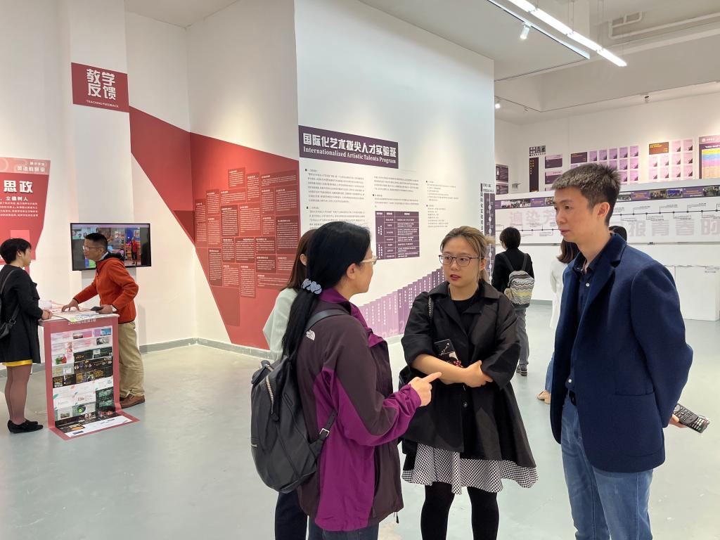 一行人在四川美术学院通识学院英语教师们的引领下步入每个展厅,认真听取川美通识学院在场几位老师对各门课程的深入介绍。各个展厅里陈列了川美核心英语课程设计、建设成果以及学生学习成果。老师们详细浏览了各种兼具艺术性和创造性的学习成果,详细询问课程教师课程建设及教学设计原则。本次展览让艺术院校通识课程的老师从幕后走到台前,走进课程展览的中心,意义非凡,对重庆市各高校外语教师在课程建设和教学创新,教师发展方面都提供了可参考案例。