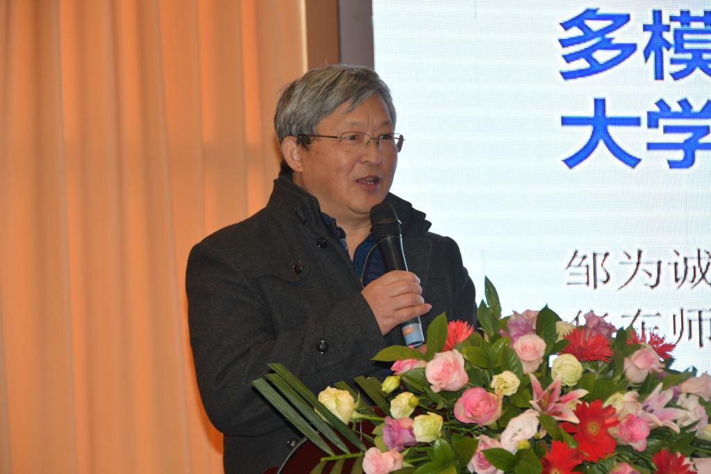 随后,研讨会主讲嘉宾华东师范大学邹为诚教授进行了题为“多维度、多模态的大学外语教学目标设定”的主题发言,从教学目标的多重意义和文化差别、如何考虑教学目标设定的问题、基本分析方法与原则、经典方法与现代教育思想;对大学英语教学改革方向的思考、学术英语教学的问题以及语言与思维和语言学习的关系七个方面进行了深入全面的剖析,引导大学英语教师充分了解教育规律,理性分析问题,清晰努力方向。邹为诚教授对当下大学英语教学改革的冷静思考和独到见解让参会老师们受益匪浅。